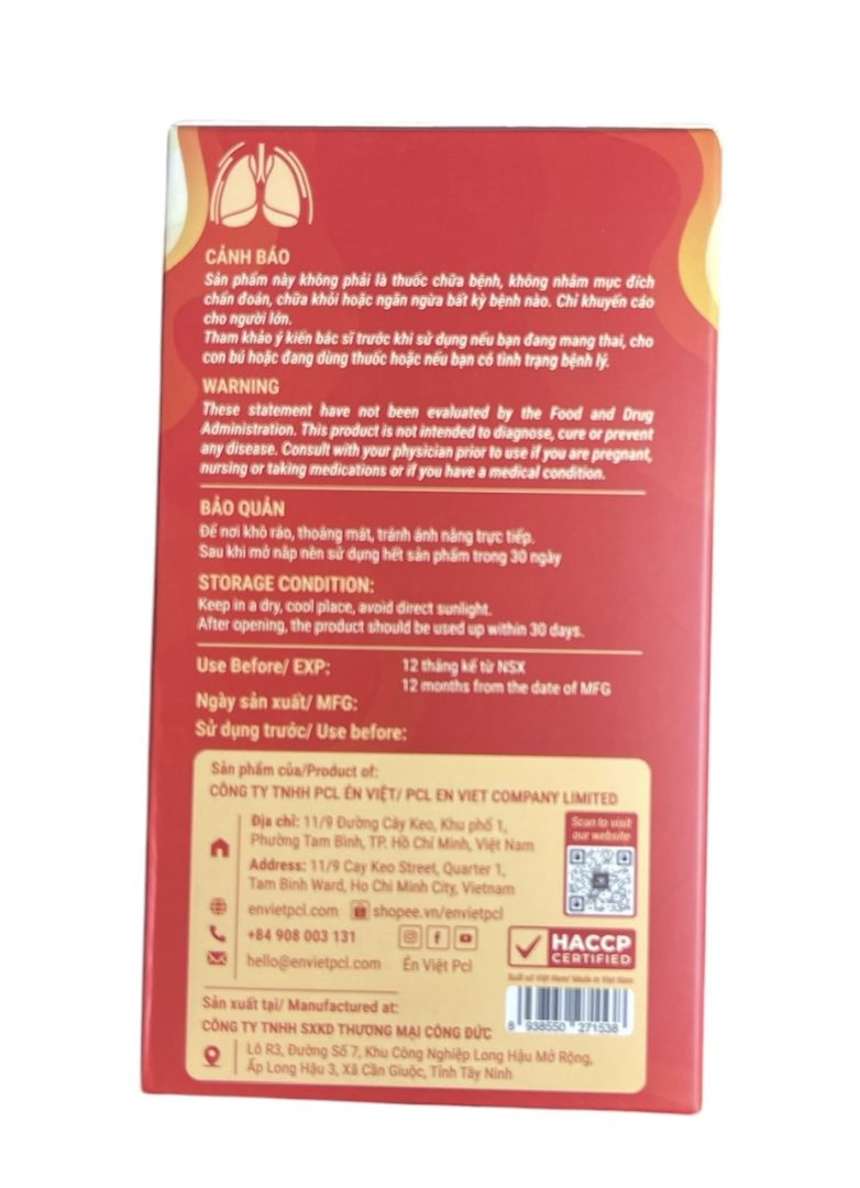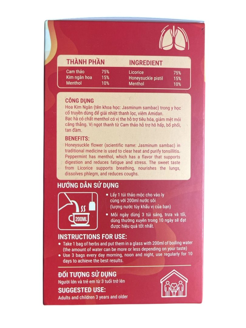 CÔNG DỤNG: Thảo Mộc AN PHỔI giúp hỗ trợ bảo vệ kháng niêm vòm họng. Hỗ trợ thanh lọc phổi giúp phổi khoẻ mạnh hơn mỗi ngày, lọc những khói bụi tác nhân từ môi trường ô nhiễm và ảnh hưởng từ khí hậu chuyển mùa. THÔNG TIN VỀ SẢN PHẨM: – Thương hiệu: Công Ty TNHH PCL Én Việt – Nơi sản xuất: Việt Nam – Sản xuất tại: CÔNG TY TNHH SX KD TM CÔNG ĐỨC – Số: – Dạng bào chế: Dạng đóng gói túi lọc – Định lượng: 2 gr / 1 túi – Quy cách: Hộp 30 túi – Bảo quản: Nơi khô ráo, thoáng mát, tránh ánh nắng chiếu trực tiếp – Hạn sử dụng: 12 tháng kể từ ngày sản xuất. NSX và HSD xem trên bao bì. Dừng uống nếu mẫn cảm với một trong các thành phần của sản phẩm. – Được sản xuất trong nhà máy đạt chứng chỉ HACCP, tiêu chuẩn GMP và tiêu chuẩn ISO 22000:2005 được kiểm soát bởi Cục An Toàn Thực phẩm. – Được cấp phép lưu hành và được kiểm định khắt khe bởi Bộ y tế về chất lượng và mức độ an toàn trước khi đưa ra thị trường. 🌺THÀNH PHẦN: – Thảo Mộc AN PHỔI được bào chế từ 3 vị thảo dược bao gồm: Cam thảo, Menthol, Kim ngân hoa. ĐỐI TƯỢNG SỬ DỤNG – Người lớn và trẻ em trên 3 tuổi bị ảnh hưởng từ dịch Covid19 – Người lớn và trẻ em trên 3 tuổi thường xuyên di chuyển những nơi có khói bụi, môi trường không khí bị ô nhiễm – Người lớn và trẻ em trên 3 tuổi bị ảnh hưởng bởi khói thuốc thụ động – Người lớn và trẻ em trên 3 tuổi ở những vùng khí hậu chuyển mùa, dễ gây ra chịu chứng ho khang, cảm cúm. – Thảo mộc hổ trợ Thanh Phổi nên dùng trước khi đi ngủ sẽ rất tốt cho hơi thở dễ ngủ hơn, giảm trằn trọc mất ngủ.